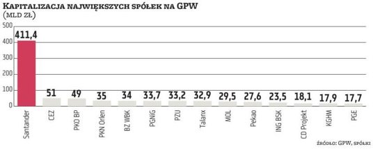 Kapitalizacja warszawskiej giełdy przekracza 1,2 bln zł. Ponad połowa tej kwoty przypada na spółki zagraniczne, w większości na Santander. Wśród firm krajowych niekwestionowanym liderem jest PKO BP, wyceniane na prawie 49 mld zł. Do pierwszej dziesiątki tego zestawienia kilka dni temu przebojem wdarł się CD Projekt, przeskakując mBank. W piątek awansował już na ósme miejsce, zostawiając w tyle KGHM i PGE.