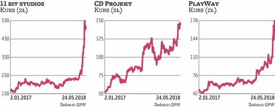 Ponad 16 mld zł wynosi już łączna kapitalizacja trzech największych producentów gier notowanych na rynku głównym. Najwięcej, bo aż 14 mld zł, przypada na CD Projekt. W czwartek jego kurs się nie zmieniał. Inwestorzy spokojnie zareagowali na wyniki za I kwartał – były gorsze niż rok wcześniej, ale zgodne z oczekiwaniami analityków. Grupa wypracowała ponad 75 mln zł przychodów i blisko 23 mln zł zysku netto.