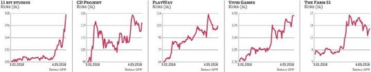 Ponad 500 mln USD wart jest polski rynek gier komputerowych i szybko rośnie. W siłę rosną też polskie studia deweloperskie. Wiele wskazuje, że po stosunkowo trudnym 2017 r. ten rok będzie dla nich udany. Kursy akcji większości z nich w ostatnich tygodniach idą w górę, a liderem wzrostów jest 11 bit studios. Od czasu debiutu „Frostpunka", czyli od 24 kwietnia, kapitalizacja spółki urosła o mniej więcej jedną trzecią.