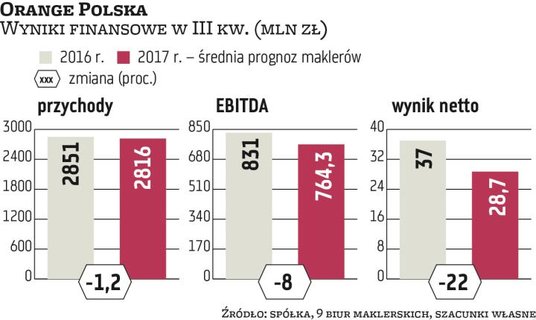 Wypadkowa założeń specjalistów mówi, że przychody Orange Polska w III kw. br. wyniosły 2,82 mld zł, czyli o 1,2 proc. mniej niż przed rokiem. Silniej – o 8 proc. rok do roku, do 764 mln zł – mogła natomiast spaść EBITDA. O ponad jedną piątą – do niecałych 29 mln zł – mógł skurczyć się wynik netto Orange Polska.
