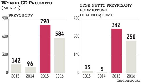 O ponad 4 proc. drożały w czwartek akcje CD Projektu. Była to reakcja na wyniki za 2016 r., które były wprawdzie gorsze od tych za 2015 rok, ale to było do przewidzenia, bo wtedy spółka miała dużą premierę „Wiedźmina 3". Sam IV kwartał 2016 r. okazał się miłą niespodzianką. Sobiesław Kozłowski, analityk z Raiffeisen Brokers, podkreśla, że przychody były o blisko 9 proc. powyżej oczekiwań, co przy utrzymaniu kontroli kosztów wpłynęło na poprawę marży operacyjnej.