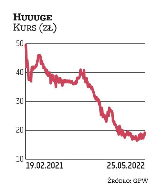 Nawet 6 proc. drożały w środę akcje Huuuge w reakcji na publikację wyników za I kwartał 2022 r. Kurs oscyluje w okolicach 19 zł (w zeszłorocznym IPO akcje sprzedawano po 50 zł). Kilka dni temu spółka ogłosiła rozszerzenie programu skupu akcji własnych z 2,5 mln do 6,5 mln. Pozostałe warunki pozostały bez zmian, w tym maksymalna kwota (100 mln zł).