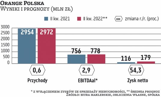 Nieznacznego wzrostu przychodów, ale sporego skoku zysku netto spodziewają się analitycy ankietowani przez „Parkiet” po wynikach Orange Polska za drugi kwartał 2022 r. Średnia prognoz biur maklerskich mówi, że w minionym kwartale ten kierowany przez Juliena Ducarroza telekom zanotował 2,97 mld zł przychodów (wzrost o 0,6 proc. rok do roku), 778 mln zł zysku operacyjnego powiększonego o amortyzację i skorygowanego o wpływy ze sprzedaży nieruchomości (wzrost o 2,9 proc. rok do roku) oraz 179 mln zł zysku netto (wzrost o ponad 54 proc.).