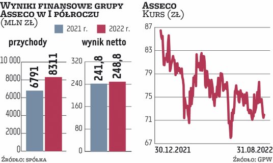 Co warto podkreślić, widać już pewną presję rosnących kosztów. W II kwartale rentowność EBIT w ujęciu non-IFRS wyniosła 11,4 proc. względem 12,4 proc. rok wcześniej. – Jej spadek jest zgodny z naszymi wcześniejszymi oczekiwaniami i wynika z efektu rynkowego – rosnących kosztów, które staramy się niwelować rosnącymi przychodami. Ten proces jeszcze potrwa – dodała wiceprezes Asseco Poland. Co więcej, w I półroczu koszty świadczeń pracowniczych zwiększyły się o 22 proc. względem I półrocza i sięgnęły ponad 4 mld zł. – 80 proc. wszystkich kosztów grupy to właśnie koszty pracy. Prowadzimy prace nad optymalizacją produkcji oprogramowania, wskaźnik rotacji zatrudnienia pozostaje na bardzo niskim poziomie. Dynamika kosztów pokazuje, że idziemy zgodnie z tym, co planowaliśmy na początku roku – uzupełnia Rzońca-Bajorek. Firma spodziewa się wypracować w tym roku 9,5 proc. rentowności operacyjnej.