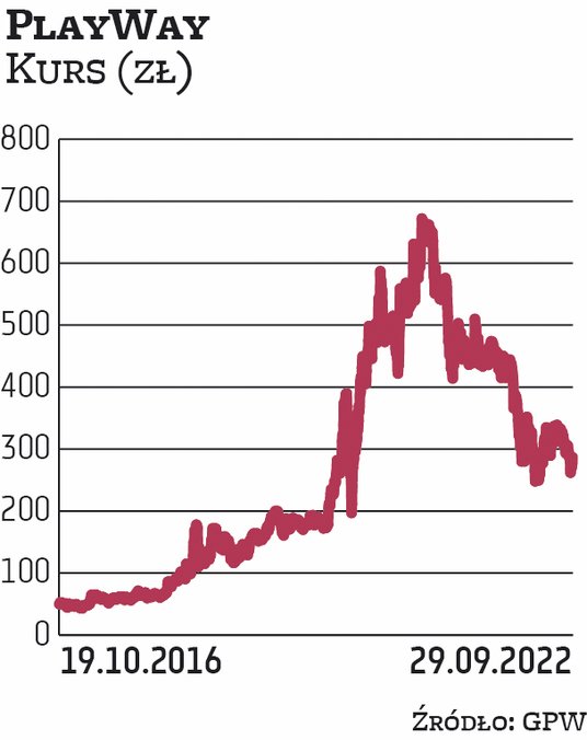Akcje w IPO sprzedawano po cenie wynoszącej 52 zł, czyli 5,5 proc. niższej od maksymalnej (55 zł). Na finiszu pierwszej sesji kurs spadł do 50 zł. Potem zaczął iść w górę, wyznaczając historyczne maksimum w styczniu 2021 r. na poziomie niemal 690 zł. Od tego czasu spadł o ponad połowę. W ostatnich dniach oscyluje w okolicach 280–290 zł, co implikuje 1,9 mld zł kapitalizacji. Ceny docelowe z rekomendacji znacząco przewyższają obecną rynkową. Średnia z wycen analityków wskazuje na 44-proc. przestrzeń do zwyżki (to oznaczałoby kapitalizację przekraczającą 2,7 mld zł). Największym giełdowym studiem jest CD Projekt. Jego kapitalizacja obecnie wynosi 10 mld zł. Wiceliderem jest PlayWay, a tuż za nim plasuje się amerykański Huuuge wyceniany na 1,8 mld zł. Próg miliarda złotych kapitalizacji przekracza jeszcze tylko dwóch producentów gier: 11 bit studios (1,2 mld zł) i PCF Group (1,1 mld zł).