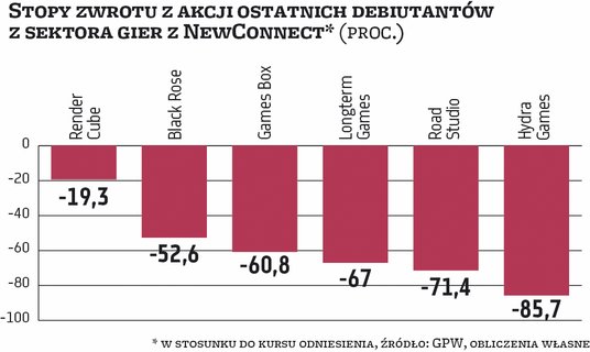 W poniedziałek na NewConnect zadebiutuje UF Games. Będzie 380. spółką notowaną na tym rynku i 15. tegorocznym debiutantem. Czas pokaże, czy przełamie złą passę. Ostatnio nowe spółki inwestorom zarobić nie dawały. Mediana stopy zwrotu z walorów sześciu ostatnich debiutantów z sektora gier na NewConnect (licząc od kursu odniesienia na pierwszą sesję do teraz) jest mocno ujemna i sięga 64 proc.