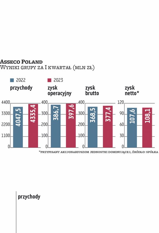 – Popyt na rozwiązania IT się utrzymuje. U nas trend spadkowy nie jest widoczny – powiedział Marek Panek, wiceprezes Asseco Poland. Pierwszy kwartał grupa miała udany. Zdaniem zarządu podobnie powinien wyglądać cały rok. Portfel zamówień (liczony w kursach stałych) ma wartość 11,7 mld zł i jest o 4 proc. wyższy niż rok temu. Najwyższą, 13-proc. dynamikę widać w polskiej części biznesu. W Asseco International portfel jest o 9 proc. wyższy niż rok temu, a w izraelskiej Formuli Systems o 2 proc. (ta relatywnie niska dynamika wynika m.in. ze zmiany metodyki liczenia portfela w tej spółce).