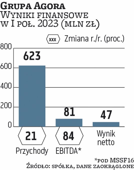 – Jedynie prognozę dla rynku reklamy zewnętrznej zdecydowaliśmy się pozostawić bez zmian – powiedziała Kryńska-Godlewska. Według odpowiedzialnego w zarządzie za ten segment Tomasza Jagiełły trwa wymiana nośników analogowych na cyfrowe, a coraz więcej miast, jak ostatnio Poznań, wytycza na nowo zasady umieszczania reklam. Mimo obaw części analityków, że będzie inaczej, drugi kwartał 2023 r. Grupa Agory (właściciel m.in. „Gazety Wyborczej”, AMS, sieci kin Helios i Radia Zet) zakończyła zyskiem operacyjnym. Przy 327 mln zł przychodów (wzrost o 25 proc. rok do roku) zanotowała 0,7 mln zł zysku operacyjnego, 44,8 mln zł EBITDA (pod MSSF16; wobec 26 mln zł rok wcześniej) i 12,5 mln zł zysku netto.