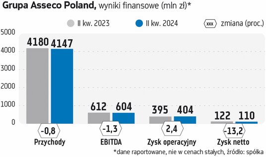 Prezentacja zarządu na temat wyników Asseco za pierwszą połowę tego roku wskazuje przy tym, że akwizycje nie były w tym czasie największym źródłem nowych przychodów i zysków rzeszowskiej grupy. Pierwsze sześć miesięcy Grupa Asseco Poland zakończyła z 8,39 mld zł przychodu, co rok do roku oznacza spadek o 1,5 proc. W samym II kwartale jej wpływy wyniosły 4,15 mld zł, o 0,8 proc. mniej niż przed rokiem.