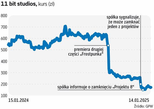 Kurs 11 bit studios zaczął wtorkową sesję od wzrostów, ale potem zaczął spadać. Po południu wynosił 169 zł. W ciągu ostatnich 12 miesięcy spadł o 69 proc. Załamał się we wrześniu po gorszej od oczekiwań premierze drugiej części „Frostpunka”. Potem osunął się jeszcze niżej po zaskakującej decyzji spółki o rezygnacji z „Projektu 8”. To właśnie ona stała się impulsem do powołania porozumienia akcjonariuszy mniejszościowych.