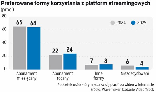 W lutowej fali badania 24 proc. ankietowanych, o 2 pkt proc. więcej niż w 2024 r., wskazało roczny abonament za najdogodniejszy. Nadal gros użytkowników woli subskrypcję miesięczną, choć grupa ta się lekko zmniejszyła (64 proc. vs 65 proc. w 2024 r.).