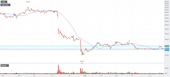 Jeśli podaż teraz przejmie inicjatywę, a kurs zejdzie poniżej lokalnej linii wsparcia, spółkę może czekać test dołka z grudnia ubiegłego roku, czyli okolic 149 zł. Poprzednio niżej tego poziomu notowania 11 bit studios były w 2017 r. W krótkim terminie nadzieją dla kupujących będzie z kolei wybicie ponad ostatni szczyt, a następnie potwierdzenie go – już jako wsparcia.