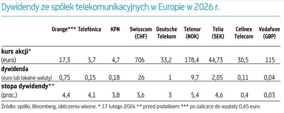 Indeks największych firm telekomunikacyjnych wywodzących się z Europy Zachodniej – Stoxx Europe 600 Telecommunications – zyskał od początku tego roku do ponad 17 proc. To efekt wzrostu zainteresowania akcjami takich firm jak największy niemiecki dostawca łączności komórkowej i przewodowej – Deutsche Telekom (kurs urósł w br. o ponad 18 proc., a wartość wszystkich akcji przekroczyła 160 mld euro), francuski Orange (plus 20 proc., kapitalizacja ponad 42 mld euro), brytyjski Vodafone (plus 14 proc., 26 mld funtów), holenderski KPN (plus 17 proc., 17,5 mld euro), szwajcarski Swisscom (21 proc., 37 mld franków szwajcarskich), czy hiszpańska Telefónica (6 proc.). W górę poszły także notowania dostawców infrastruktury telekomunikacyjnej: Ericssona (plus 11 proc.), czy Nokii (8 proc.). Efekty tego rajdu widać także na polskiej giełdzie.