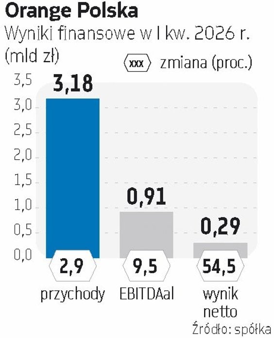 Po pierwszych trzech miesiącach br. przy 3,18 mld zł przychodu (wzrost o 2,9 proc. rok do roku) Orange Polska wykazał 913 mln zł zysku operacyjnego powiększonego o amortyzację i koszty leasingu (EBITDAal, plus 9,5 proc. wobec danych porównywalnych), 443 mln zł zysku operacyjnego (wzrost o 42 proc.) i 295 mln zł zysku netto (wzrost o 54 proc.).