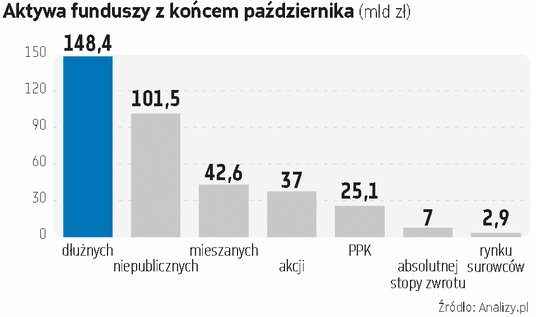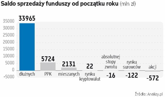 Wciąż motorem sprzedaży były produkty dłużne, do których w ubiegłym miesiącu trafiło blisko 4,4 mld zł, a to oznacza niemal 34 mld zł wpłat w ciągu 10 miesięcy tego roku. Fundusze dłużne ściągają główny strumień wpłat, a to oznacza, że ich rynkowa pozycja cały czas rośnie. Z końcem października w tych produktach zgromadzonych było niemal 48 proc. łącznych aktywów zarządzanych przez TFI. Trzeba też przyznać, że klienci TFI dobrze na tym wyszli. Dla funduszy dłużnych ten rok jest bardzo udany – na koniec października średnia stopa funduszy papierów skarbowych wyniosła aż 8 proc. Z kolei rozwiązania o najniższym ryzyku wypracowały przynajmniej po 5 proc.