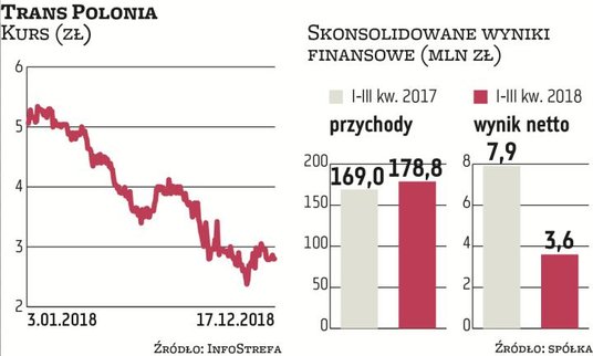 W przyszłym roku głównym celem Trans Polonii będzie ukończenie przyspieszonego programu inwestycyjnego obejmującego zakup taboru drogowego. Wydatki na ten cel mają być zbliżone do tegorocznych. – Mamy na myśli co najmniej kilkanaście milionów złotych przeznaczonych na nowe jednostki. Jednocześnie prowadzimy stały program wymiany floty w ramach działań odtworzeniowych – mówi Dariusz Cegielski, prezes Trans Polonii. Spółka na lata 2018–2020 zaplanowała wydatki w tabor w łącznej kwocie 60 mln zł. Mocno je jednak przyśpieszyła i w większości już zrealizowała.