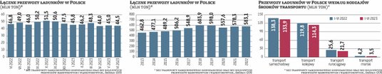 Ciekawa sytuacja była w samym czerwcu. W porównaniu z tym samym miesiącem 2022 r. przewozy kolejowe spadły już o 7,5 proc., a drogowe wzrosły o 1,3 proc. Ponadto pogłębiła się skala zniżek w obszarze transportu rurociągowego (spadek o 21,1 proc.) i morskiego (o 23,1 proc.).