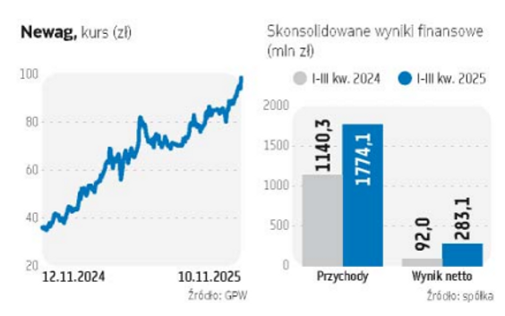 Obecne zwyżki kursu akcji to konsekwencja opublikowania przez Newag wstępnych jednostkowych i skonsolidowanych danych finansowych za trzy kwartały tego roku. W tym czasie grupa wypracowała 1,77 mld zł przychodów ze sprzedaży, co w ujęciu rok do roku oznaczało wzrost o 55,6 proc. Z kolei EBITDA sięgnęła 394,9 mln zł, a zysk netto 283,1 mln zł, co przełożyło się na ich zwyżkę, odpowiednio o 159,1 proc. i 207,8 proc. Również te wyniki były najwyższe w historii firmy.