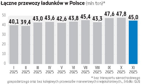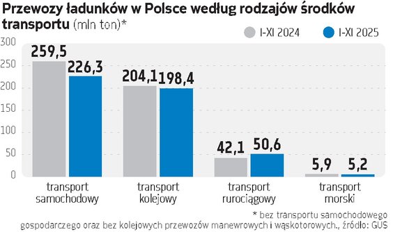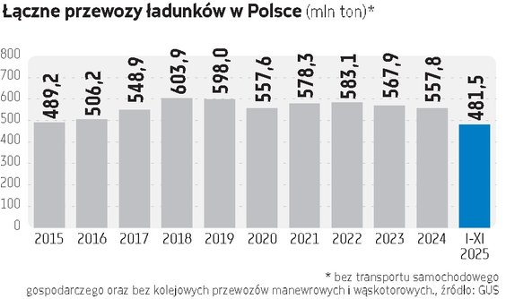 Od 2023 r. szeroko rozumiana branża transportowo-spedycyjno-logistyczna (TSL) notuje w Polsce spadki. Zmian w tym zakresie nie przyniósł również 2025 r. Z najnowszych danych GUS-u wynika, że po 11 miesiącach przewozy ładunków spadły w ujęciu rok do roku o 6 proc., a w samym listopadzie o 4,7 proc. Szczególnie zła sytuacja ma miejsce w transporcie samochodowym. W tym roku przewieziono po krajowych drogach o 12,8 proc. mniej ładunków niż rok temu. W transporcie morskim zniżka wyniosła 10,9 proc., a w kolejowym o 2,8 proc. Wzrost, w dodatku istotny, gdyż ponad 20-proc., zanotowano za to w transporcie rurociągowym.