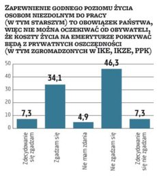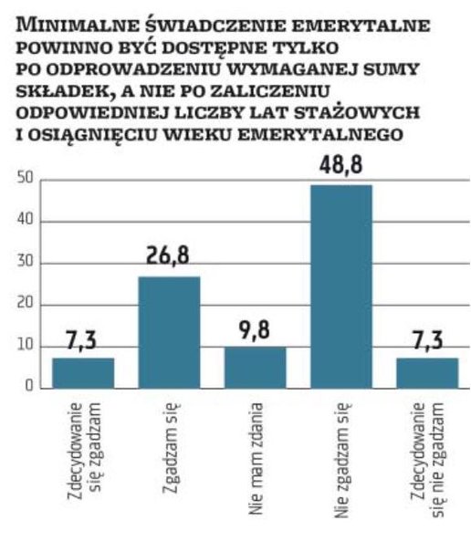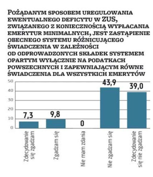 Z tezą, że dobrą odpowiedzią na wyzwania związane ze starzeniem się ludności byłoby zastąpienie obecnego systemu emerytalnego, różnicującego świadczenia w zależności od odprowadzonych składek, systemem zapewniającym równe świadczenia dla wszystkich emerytów i opartym wyłącznie na podatkach powszechnych, zgodziło się (w tym zdecydowanie) siedmioro spośród 41 (czyli 17 proc.) ankietowanych przez nas ekonomistów. Przeciw tej koncepcji opowiedziało się (w tym zdecydowanie) 34 uczestników naszej sondy (83 proc.). W żadnej innej sprawie, o którą pytaliśmy wcześniej ekonomistów – a łącznie zadaliśmy 15 pytań w czterech blokach tematycznych – nie panowała wśród nich taka jednomyślność.