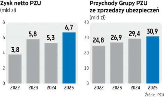 Przychody brutto Grupy PZU ze sprzedaży ubezpieczeń sięgnęły w minionym roku rekordowych 30,9 mld zł i były o 1,5 mld zł, czyli o 5 proc., wyższe niż rok wcześniej. Zysk netto dla akcjonariuszy PZU sięgnął w 2025 r. także rekordowych 6,7 mld zł, co oznacza wzrost o 25,4 proc. względem 2024 r.