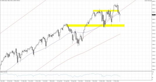 Pozostałe indeksy próbują dziś odrabiać część wczorajszych spadków, niemniej jednak na rynku dominuje niedźwiedzi sentyment wynikający z oczekiwań na normalizacje polityki monetarnej w USA. Rynek czeka na jutrzejsze dane o grudniowej inflacji, wobec których spodziewa się przyspieszenia dynamiki cen do 7.1% r/r z 6.8% r/r odnotowanych przed miesiącem. Potwierdzenie tych danych oznaczałoby najwyższą inflację w USA od 4 dekad i zwiększałoby presję na podwyżkę stóp podczas marcowego posiedzenia. Rynek w perspektywie do końca roku wycenia już od 3 do 4 podwyżek stóp w USA. Pojawiają się coraz większe obawy, że silny wzrost inflacji w 2021 nie był tylko przejściowy, szczególnie w sytuacji szybko rozprzestrzeniającego się Omikrona, który może pogłębiać problemy podażowe. W Chinach zdecydowano się na kolejne ograniczenia, a Japonia zamyka zamyka granice do końca lutego. Pfizer poinformował o pracowaniu szczepionki dającej ochronę przed nową mutacją, ale uwzględniając szybkość jej rozprzestrzeniania się, szeroka dystrybucja może zająć zbyt wiele czasu. Elementem, który może poprawić nastoje pozostaje tylko rozpoczynający się sezon wyników. W czwartek, jako pierwsze zaprezentowane zostaną rezultaty działalności amerykańskich instytucji finansowych. Podczas wczorajszej sesji notowania kontraktu terminowego na S&P500 zanurkowały poniżej 4600 pkt., niemniej jednak nie pozostały tam długo. Obecnie kluczową strefą wsparcia jest poziom 4500 pkt. We wtorkowy poranek niemiecki Dax pozostaje natomiast w strefie 15800-16000 pkt.