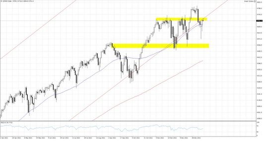 Dziś poznamy najważniejsze dane tygodnia, jakim będzie grudniowy odczyt inflacji w USA. Oczekiwania rynkowe wskazują na wzrost dynamiki cen do 7.1% r/r z 6.8% r/r odnotowanych przed miesiącem, a potwierdzenie tego odczytu oznaczałoby najwyższą inflację w USA od 4 dekad. Same dane nie powinny wpłynąć już na oczekiwania wobec marcowej podwyżki, która jest już w cenach. Reakcja rynkowa nie powinna być już zatem duża, choć zaskoczenie po wyższej stronie może zwiększać obawy związane z silniejszym zacieśnieniem polityki monetarnej. Rynek w perspektywie do końca roku wycenia już od 3 do 4 podwyżek stóp w USA. Słabszy odczyt powinien natomiast łagodzić niepokój dotyczący się zbyt dużego umocnienia presji cenowej, co powinno wspierać odbicie na Wall Street. Notowania kontraktu terminowego na S&P500 dobijają obecnie do pierwszej strefy oporu na 4700 pkt. Podobnie niemiecki Dax walczy o powrót powyżej strefy 16000 pkt.