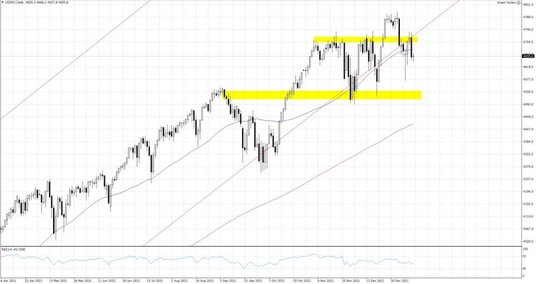 Podkreśliła ona, że podwyżka stóp w marcu może być konieczna, aby opanować umacniającą się inflację. Nie przełożyło się to jednak na wzrost rentowności na rynku długu czy umocnienie dolara. Oprocentowanie amerykańskich obligacji skarbowych w przypadku dziesięciolatek pozostaje blisko 1.7%, a kurs EURUSD dalej podąża w kierunku strefy oporu w okolicy 1.15. S&P500 stracił wczoraj 1.4%, a przemysłowy Dow Jones jedyne 0.5%. W piątkowy poranek notowania kontraktów terminowych na amerykańskie indeksy próbują odrabiać część wczorajszych strat. Na otwarciu handlu na Starym Kontynencie niemiecki Dax cały czas pozostaje w przedziale 15800, a 16000 pkt. Od dziś uwaga rynków z polityki monetarnej powinna przekładać się na sezon wyników, bowiem przed rozpoczęciem handlu na Wall Street poznamy rezultat działalności Wells Fargo czy Citigroup, które będą barometrem tego jak radziła sobie cała amerykańska gospodarka w końcówce 2021 roku i jednocześnie kształtowały się oczekiwania przed kolejnymi publikacjami.