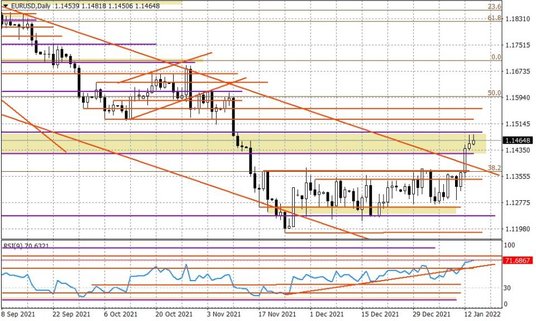 Wczoraj po południu mieliśmy próbę nieznacznej korekty EURUSD po wybiciu z ostatnich dni, ale była ona krótkotrwała. Dzisiaj notowania minimalnie pobiły wczorajszy szczyt przy 1,1481. Wygląda na to, że rynek nie ma zbytnio ochoty realizować ruchu powrotnego w stronę 1,14, choć takowy teoretycznie cały czas jest możliwy. Problem jednak w tym, że inwestorzy przestali już wierzyć w "gołębią gadaninę" ze strony przedstawicieli Europejskiego Banku Centralnego, co pokazuje chociażby zachowanie się niemieckich bundów w ostatnich tygodniach. Z kolei osłabienie dolara widoczne jest na szerokim rynku i trudno może być o mocne argumenty za zmianą tego trendu. FED widzi podwyżkę stóp już w marcu, chociaż dane z realnej gospodarki (poza inflacją) mogą zacząć wskazywać na jej nieznaczne wyhamowanie w I kwartale, a Omikron będzie w tym pomagać. Rynek zdaje się jednak zakładać, że marcowa podwyżka będzie konieczną reakcją na opóźnienia z II połowy 2021 (kiedy to należało podnieść stopy), a cała dyskusja będzie się koncentrować na tym, kiedy FED zacznie realnie redukować swój bilans (program QT). Napływające ostatnio sygnały od członków FED sygnalizują, że raczej będzie to temat na dalszą część roku, a nie na lipiec, jak to widzą eksperci z Goldman Sachs.