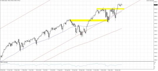 Ruch wydaje się być napędzany przez oczekiwania związane z normalizacją polityki monetarnej w USA. Rentowności amerykańskich obligacji skarbowych cały czas pozostają wysoko. Spółki technologiczne w czasie pandemii najmocniej zyskiwały na niskich rentownościach. W Europie nastroje pozostają bez większych zmian, a sesja rozpoczyna się w pobliżu wczorajszego poziomu odniesienia. Niemiecki Dax pozostaje bowiem powyżej 16100 pkt., a droga w kierunku odnotowanych w listopadzie szczytów wszechczasów jest otwarta. Dla sytuacji rynkowej w drugiej połowie tygodnia kluczowe będą najbliższe dane. Dziś opublikowany zostanie raport ADP zapowiadający piątkowy oficjalny raport z amerykańskiego rynku pracy za grudzień oraz minutki z ostatniego posiedzenia Fed. Dokument ten może rzucić nieco więcej światła na termin pierwszej podwyżki stóp procentowych w USA. Uważany za przedstawiciela gołębiego skrzydła Fed Kashkari z oddziału w Minneapolis powiedział wczoraj, że opowiada się za dwoma podwyżkami stóp w 2022 roku, aby przeciwdziałać ryzyku narastającej inflacji. Zmienił on swoje nastawienie ze względu na to, że dynamika cen okazała się wyższa od oczekiwań i bardziej trwała. Jutro natomiast poznamy usługowy odczyt ISM za grudzień. Opublikowane wczoraj dane z przemysłu zaskoczyły po niższej stronie, a wskaźnik obniżył się do 58.7 pkt. z 61.1 pkt. przed miesiącem.