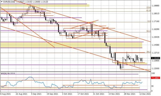 Na wykresie EURUSD widać, że podaż nie ma zbytnio siły, aby uporać się ze strefą wsparcia 1,1240-60. Czy stanie się tak po informacjach z FED (jutro wieczorem), oraz ECB (w czwartkowe popołudnie)? Niekoniecznie. Ryzyko związane z szybkością szerzenia się wariantu Omikron na świecie, może zacząć wymuszać większe obostrzenia i tym samym podbijać niepewność, co do sytuacji w I i II kwartale 2022. Stąd też wydaje się, że FED, ale i też EBC skupią się na temacie skupu aktywów (FED przyspieszy tapering, a EBC może dać do zrozumienia, że APP, który od kwietnia 2022 r. pozostanie jedynym programem QE po zakończeniu PEPP, nie będzie aż tak wyraźnie podniesiony). Jeżeli FED pominie juto temat podwyżki stóp procentowych jeszcze w I półroczu 2022 r. (to chciałyby widzieć rynki), to może to dać pole do rozczarowania i osłabić dolara. Z kolei dla ECB "gołębie" karty zostały już rozdane w ostatnich tygodniach i mamy pole do lekkiego podbicia w "jastrzębią" stronę.