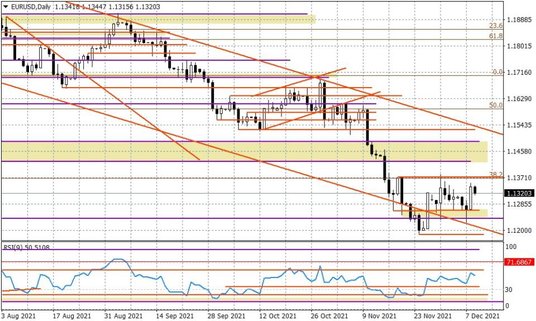 Po tym jak próba zejścia poniżej strefy wsparcia 1,1240-60 nie była zbyt udana, mieliśmy bardziej zdecydowane uderzenie popytu. Notowania EURUSD powróciły wczoraj wyraźnie ponad poziom 1,13, co może sygnalizować początek fali wzrostowej, która mogłaby doprowadzić nawet do naruszenia ważnego oporu przy 1,1370? Skąd taki optymizm? Przede wszystkim większe pole do zaskoczenia rynków jest po stronie EBC, niż FED. Decyzja Rezerwy Federalnej na przyszłotygodniowym posiedzeniu jest względnie przewidywalna i większe jest ryzyko po stronie negatywnych zaskoczeń - niewielkie przyspieszenie tempa taperingu, zasłanianie się Omikronem w przypadku prognozowania podwyżek stóp w 2022 r. itd. Tymczasem w gronie EBC trwa właśnie dyskusja o tym, jak ma wyglądać program skupu APP, który zastąpi PEPP wiosną przyszłego roku. Niewykluczone, że może być to pierwszy krok do normalizacji polityki, jeżeli decydenci uznają, że skala APP nie powinna być porównywalna z PEPP.