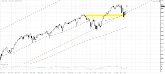 Jak wynika ze wstępnych wyników badań przyjęcie trzeciej dawki preparatu powinno dawać ochronę przez Omikronem, na dwie dawki mają być wystraczające do uniknięcia ciężkiego zachorowania. Szczegółowe wyniki badań mają być dostępne przed końcem roku, a szczepionka w większym stopniu koncentrująca się na nowej mutacji wirusa ma być natomiast gotowa na wiosnę. Widać, że te informacje nie zdjęły całego ciężaru związanego z zagrożeniami dotyczącymi Omikrona i potrzeba więcej konkretów w tej kwestii. Dziś w kalendarium makroekonomicznym znajdziemy tylko cotygodniowe dane o ilości nowych bezrobotnych, a jutro ostatni ważny odczyt przez przyszłotygodniowym posiedzeniem Fed, listopadową inflacją. Przypomnijmy, że rynek spodziewa się wzrostu dynamiki cen do 6.7% z 6.2% r/r odnotowanych w październiku. Jeśli dane zaskoczą po wyższej stronie wówczas mogą nasilić się oczekiwania względem Fed i przyspieszenia tempa normalizacji. Na otwarciu handlu na Starym Kontynencie niemiecki Dax cofa się poniżej 15700 pkt., podczas gdy notowania kontraktu terminowego na S&P 500 są tuż pod 4700 pkt. Nastrojom nie pomagają informacje wskazujące, że Omikron rozprzestrzenia się ponad 4-krotnie szybciej niż wariant delta.