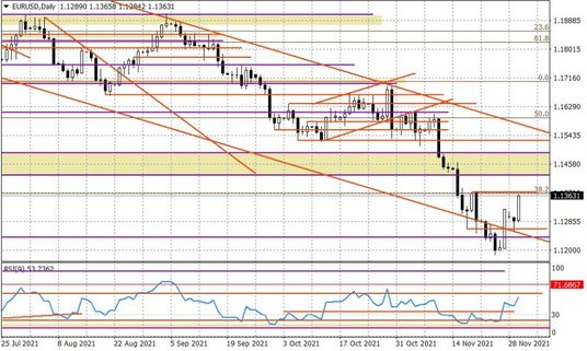 Powrót trybu risk-off na rynki po słowach szefa Moderny, że być może pod Omikrona trzeba będzie opracować zupełnie nową szczepionkę, dał argumenty za podbiciem euro (analogicznie jak miało to miejsce w piątek). Z kolei fakt, że Jerome Powell znów zagrał "gołębim" schematem znanym z poprzednich fal pandemii, negatywnie zaważył na dolarze. Efekt to kontynuacja wzrostów EURUSD w okolice szczytów z połowy listopada w okolicach 1,1370? Co dalej? Czy możemy wyjść wyżej?