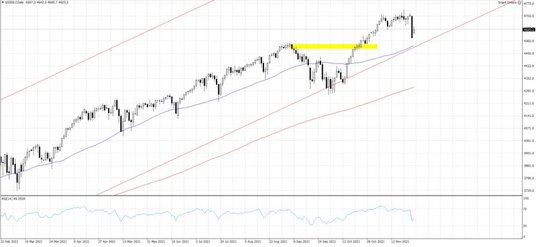 Obawy przed przywracaniem restrykcji i spadkiem popytu na ropę przeceniły ją o 12%, a baryłka WTI znalazła się nawet poniżej 70 USD. W trakcie weekendu pojawiły się jednak pierwsze wyniki badań nad nową mutacją, które wskazują na łagodny przebieg choroby, co sprzyja częściowemu odreagowaniu piątkowej paniki. Notowania kontraktu terminowego na S&P 500 wracają powyżej 4600 pkt., a baryłka WTI dobija do 72 USD. Choć poniedziałkowa reakcja wskazuje na szybkie podkupowanie dołków, to jednak jeszcze dużo niepewności utrzymuje się w kontekście nowego wariantu i jego przełożenia na wyhamowanie ożywienia. Zachowanie rynków w kolejnych tygodnia zależeć będzie od kolejnych wyników badań nad nową mutacją, a szczególnie tego, czy zaszczepione osoby posiadają na niego odporność. Jeśli nie, przywracanie restrykcji na szerszą skalę jest możliwe, co może prowadzić do kolejnych perturbacji rynkowych. Jeśli natomiast dostępne preparaty dają odporność na nową mutację, skala odbicia może być dynamiczna i rajd świętego Mikołaja może być wyjątkowo udany w tym roku.