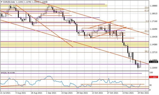 Z technicznego punktu widzenia ruch na EURUSD jest zasadny - dzienny oscylator RSI9 od kilku dni nie autoryzował spadków, a wybicie ponad opór 1,1225-30 może otwierać drogę do szczytów z zeszłego tygodnia przy 1,1370. A fundamentalnie? Wzrost euro tylko pozornie może dziwić - dzięki "staraniom" EBC wspólna waluta stała się narzędziem do finansowania różnych spekulacji na rynkach finansowych (tak jak przez lata taką rolę pełnił jen). Tym samym w momencie wyraźnej ucieczki inwestorów od ryzyka, cały proces się odwraca - spekulacyjne aktywa są sprzedawane, a euro trzeba odkupić. Ale i też w analizie EURUSD nie zapominajmy o pozycji amerykańskiego dolara. Ten dzisiaj wygląda dobrze na szerokim rynku, ale tylko pozornie. Koszyk dolara FUSD spada, gdyż z kluczowymi walutami w G-10 amerykański dolar przegrywa. I ta tendencja może się pogłębić. Widać ruch w dół na rentownościach amerykańskich obligacji, co można interpretować dwojako - ucieczkę w dług, jako bezpieczne aktywo, albo weryfikację dotychczasowych oczekiwań wobec FED w obliczu pojawienia się nowego, niebezpiecznego wariantu koronawirusa. Dolar straciłby, zatem jeden z kluczowych motywów, które ostatnio pchały jego notowania w górę.