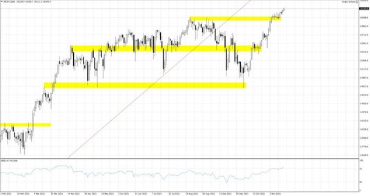 Nie pozostaje to bez wpływu na rynek akcyjny. O ile poniedziałkowa sesja na Wall Street nie przyniosła istotnych zmian, a główne indeksy pozostawały blisko poziomu odniesienia, o tyle niemiecki Dax zdołał wykreślić nowe szczyty wszechczasów powyżej 16100 pkt. Spadek kursu EURUSD zwiększa powiem konkurencyjność cenową tamtejszych eksporterów. Notowania kontraktu terminowego na S&P 500 cały czas pozostają poniżej 4700 pkt. Poniedziałkowe rozmowy prezydentów Bidena i Xi nie zakończyły się niczym przełomowym, a strony podkreśliły tylko niechęć do prowadzenia konfliktu. Był to jednak tylko wstęp do dalszej dyskusji.
