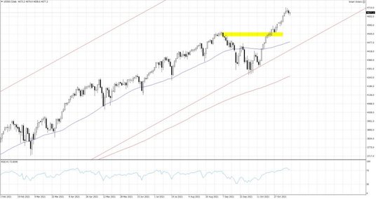 Skala korekty pozostaje niewielka i sięga 0.5%. W trakcie sesji azjatyckiej nastroje rynkowe popsuły dodatkowo wyższe od oczekiwań dane o październikowej inflacji w Chinach. Ta wzrosła do 1.5% r/r z 0.7% r/r i prognozowanych 1.4% r/r. Dziś w centrum uwagi znajdują się analogiczne dane z USA i rynek czeka na najwyższy od początku lat 90-tych odczyt. Konsensus rynkowy zakłada wzrost dynamiki cen do 5.8% r/r z 5.4% r/r, a wyższy odczyt może umacniać oczekiwania na szybszą normalizację polityki monetarnej w USA. Inflacja cen producentów w Chinach, bardziej uwzględniająca problemy w łańcuchu dostaw, wzrosła w październiku do najwyższego poziomu od 26 lat i wyniosła 13.5% r/r wobec 10.7% r/r we wrześniu i oczekiwanych 12.4%. Producenci częściowo wyższe koszty będą przerzucać na konsumentów, przez co wysoka inflacja może się utrzymywać również w 2022 roku. W centrum uwagi znajdują się taniejące akcje Tesli, które straciły wczoraj 12%. To jeszcze po weekendowym zamieszaniu dotyczącym ankiety Elona Muska w sprawie sprzedaży 10% posiadanych przez niego akcji spółki. Dodatkowo Nvidia kontynuuje prace nad pojazdami autonomicznymi, co zwiększa presję na wysoką wycenę Tesli. O ile w przypadku popularnego producenta aut elektrycznych poziom wyceny to duża niewiadoma, o tyle układ sił na Wall Street cały czas wpiera byczo nastawionych inwestorów, a ostatnie wydarzenia powinny być traktowane jako korekta w trendzie wzrostowym.
