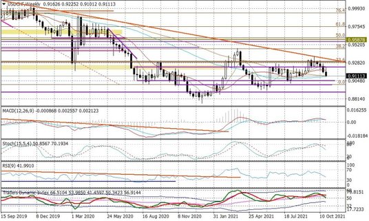 Piątek przynosi odbicie dolara na szerokim rynku w ślad za pogorszeniem się nastrojów na giełdach. Na Wall Street technologiczny Nasdaq zawrócił po wybiciu nowego szczytu, a gorsze informacje ze spółki Amazon, która zwróciła uwagę na trudności będące efektem globalnych problemów z łańcuchami dostaw, mogą stać sie mocniejszym story dla rynków. Słabsze nastroje widoczne były też w Azji, chociaż Evergrande poinformowało o planach spłaty kolejnej transzy zaległych odsetek, a Ludowy Bank Chin kontynuował operacje płynnościowe (w tym tygodniu wpompowano 680 mld juanów, co jest najwyższą kwotą od blisko 2 lat).