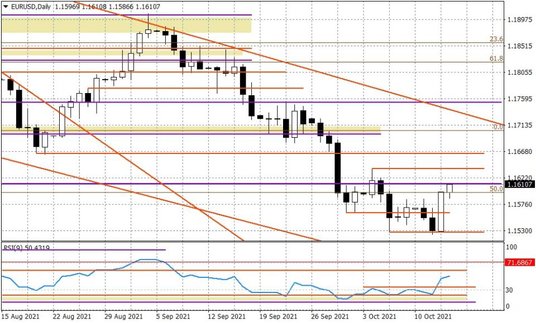 Odbicie czas zacząć? Na taki scenariusz dla EURUSD wskazywałem w ostatnich dniach zwracając uwagę na fakt wyraźnych dywergencji na dziennym RSI9 (czynnik techniczny), oraz znużenia rynków "gołębią" retoryką EBC, która notabene brzmi coraz mniej wiarygodnie w kontekście tego, co mówi się na temat globalnych perspektyw inflacji. Specyfika wczorajszego ruchu przypomina bardziej szybkie pokrywanie krótkich pozycji w EURUSD, choć główne skrzypce grał tu słaby dolar na głównych ustawieniach. Co dalej? Wydaje się że ruch może być kontynuowany. Analiza techniczna nie wyklucza testu linii trendu spadkowego przy 1,17 w kolejnych dniach, chociaż najbliższy opór to szczyt przy 1,1639 z 4 października b.r.