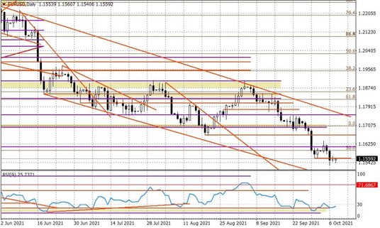 Mimo "gołębiej" narracji płynącej w ostatnich dniach z EBC, notowania EURUSD nie pogłębiły spadków schodząc poniżej minimum ze środy przy 1,1528. To sygnał do potencjalnego przełomu, chociaż katalizatorem będzie tu bardziej dolar, niż euro. W tym ostatnim przypadku można spodziewać się tylko tego, że bardziej "gołębio" już nie będzie, a sam rynek może zacząć też podważać słuszność retoryki EBC, jeżeli inflacja będzie nadal rosnąć. W temacie dolara to istotne będą dzisiejsze dane Departamentu Pracy, oraz reakcja na tą publikację. Wydaje sie, że wątek taperingu FED w listopadzie jest już w cenach i możemy zobaczyć tzw. sprzedaż faktów.