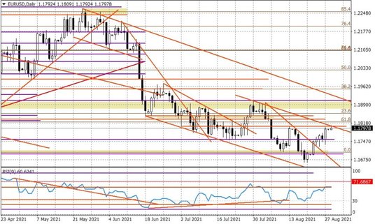 W piątek wieczorem dolar był w odwrocie po słowach Powella, w czym pomagały dodatkowo spadające rentowności amerykańskich obligacji - 10-letnie powróciły do 1,30 proc. To wywindowało notowania EURUSD w okolice 1,18. Dzisiaj przetestowany został rejon spadkowej linii trendu przy 1,1810 i podejście nie było udane. To może zapowiadać korektę ostatniego wzrostu, lub po prostu powrót w stronę silnego dolara zgodnie z dominującym trendem obserwowanym od pierwszych dni czerwca. Wiele będzie zależeć od tego jak podejdziemy do piątkowych danych Departamentu Pracy. Jeżeli rynek zbuduje wokół nich scenariusz zakładający, że kolejny odczyt NFP rzędu 0,9-1,0 mln będzie wystarczający do tego, aby FED podjął poważną dyskusję nad taperingiem, to niewykluczone, że w kolejnych dniach powrócimy w stronę 1,17.
