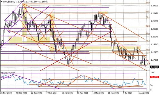 Obawy związane z wrześniowym taperingiem nasiliły się po publikacji minutek z lipcowego posiedzenia FED, prowadząc do wyraźniejszego umocnienia się dolara na szerokim rynku. Efekt to połamanie wsparcia przy 1,17 przez EURUSD. Dzisiejszy dołek to 1,1664 skąd widać próbę wyprowadzenia tzw. ruchu powrotnego w stronę wybitego ważnego poziomu. W szerszym kontekście uwagę zwraca klin na dziennym wykresie, który kończy się w okolicach 1,16, gdzie można wyznaczyć wsparcie na bazie dołka z września i listopada ub.r. Analiza techniczna podpowiada, że do opuszczenia klina powinno dojść po 26 sierpnia, czyli wtedy, kiedy wypada początek sympozjum w Jackson Hole. Zwyczajowo ta formacja zapowiada odwrócenie trendu, co być może będzie mieć miejsce, jeżeli Jerome Powell nie spełni oczekiwań i nie da wskazówek, że decyzja o taperingu może być brana pod uwagę już na wrześniowym posiedzeniu.