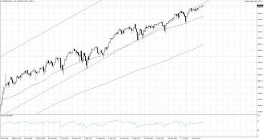 To dało przestrzeń do wzrostów bardziej ryzykownych aktywów. Środowa sesja na Wall Street zakończyła się wyrysowaniem nowych szczytów w przypadku przemysłowego Dow Jonesa i S&P 500 podczas gdy technologiczny Nasdaq spadł o niecałe 0.2%. Spółkom z tego sektora ciąży obecnie odbicie rentowności amerykańskich obligacji skarbowych. Przedsiębiorstwa przemysłowe inwestorzy mogą natomiast faworyzować przez przeforsowanie pakietu infrastrukturalnego. Na otwarciu dzisiejszego handlu niemiecki Dax pozostaje blisko wczorajszego szczytu powyżej 15800 pkt. Wprowadzane przez Chiny regulacje spółek technologicznych ciążą azjatyckim parkietom. Tamtejsze władze opublikowały 5-letni plan, który ma prowadzić do ściślejszego nadzoru całego sektora. Dziś w kalendarium warto zwrócić uwagę na cotygodniowe dane o liczbie nowych bezrobotnych, których waga ze względu na kształtowanie oczekiwań przed sierpniowym raportem z rynku pracy, może być wiesza niż zwykle. Od niego bowiem prawdopodobnie zależeć będzie to co wydarzy się podczas wrześniowego posiedzenia Fed.