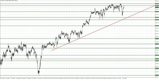Skala zmiany jest niewielka i na razie nie sugeruje niczego poza tym, że mamy do czynienia z korektą i to do tego z małej skali. Główne indeksy akcji przebywają w okolicy szczytów, a jak pamiętamy z ubiegłego tygodnia, nastroje są raczej mało optymistyczne, co sprawia, że potencjał ewentualnego ruchu w dół nie jest specjalnie duży. Indeks DAX cofa się od okolicy 15700 pkt., czyli od oporu, ale bliskość rekordów pozwala sądzić, że to jeszcze nie koniec akcji popytu. Wsparciem w krótkim horyzoncie jest okolica 15450 pkt.