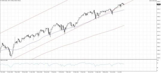 Jak na razie zagrożenia związane z rozprzestrzenianiem się wariantu Delta nie wydają się na tyle duże aby mocniej zagrozić sytuacji na rynku akcyjnym. Z drugiej strony retoryka amerykańskiej Rezerwy Federalnej pozostaje gołębia i w kolejnych miesiącach pełne wsparcie dla gospodarki będzie utrzymywane. Dodatkowo patrząc na pierwsze wyniki amerykańskich banków można pozostawać umiarkowanie optymistycznie nastawionym do ruszającego sezonu wyników. Wydaje się, że za wcześnie jest jeszcze na większą korektę, a ryzyka dla cen akcji pozostają skierowane w górę. Dziś w kalendarium makroekonomicznym warto zwrócić uwagę na wyniki czerwcowej sprzedaży detalicznej w USA oraz raport Uniwersytetu Michigan, odzwierciedlający nie tylko nastroje gospodarstw domowych w mijającym miesiącu ale i oczekiwania inflacyjne.