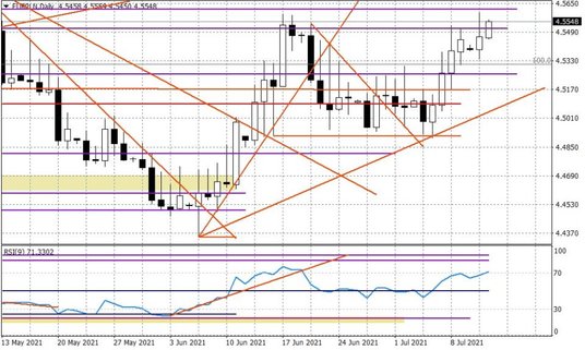 Na pocieszenie można dodać, że zmiany są niewielkie (0,25 proc.). Tyle, że tendencja słabości złotego trwa już od pewnego czasu. Wczoraj zachowywaliśmy się najgorzej w regionie. Powód? Gołębie sygnały płynące od naszych decydentów - w zeszłym tygodniu RPP dała do zrozumienia, że nie widzi potrzeby zmiany polityki monetarnej w nadchodzących miesiącach, a opublikowane wczoraj nowe projekcje makro pokazały tak naprawdę, że na wyraźniejsze cofnięcie się inflacji nie ma co liczyć w nadchodzących latach, co de facto sankcjonuje wysokie, ujemne, realne stopy procentowe. Na to wszystko nakłada sie globalna niepewność związana z dalszym rozprzestrzenianiem się wariantu Delta i nawrotem restrykcji z jednej strony, a potencjalnymi zmianami w polityce FED w najbliższych miesiącach z drugiej. Tu ważne będą dzisiejsze dane CPI z USA o godz. 14:30, oraz zaplanowane na jutro i czwartek zeznania Jerome Powella w Kongresie.