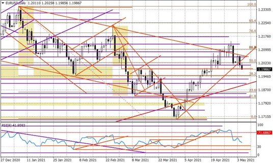 Opublikowane kilkanaście minut temu ostateczne dane PMI dla usług ze strefy euro za kwiecień wypadły nieco lepiej od prognozy (50,5 pkt.), ale nie wsparły wspólnej waluty. Na wykresie EURUSD widać niemalże książkowy proces odwracania trendu, którego byliśmy świadkiem w ostatnich dniach. To może zapowiadać większy ruch spadkowy, a otwartym pytaniem pozostaje to, czy nadal jesteśmy w szerokim kanale spadkowym, którego nieudana próba wybicia górą (przez 1,21) miała miejsce tydzień temu. W takiej sytuacji w maju możliwe byłoby testowanie okolic 1,1834 (minimum z 9 marca), a nawet 1,1703 (dołek z 31 marca).