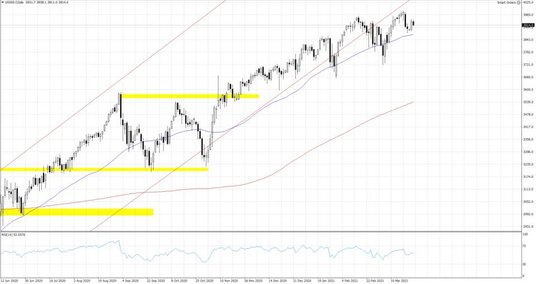 Na ochłodzenie nastrojów wpływ ma rozwój sytuacji w walce z pandemią w Europie. Niemcy zdecydowali się bowiem na zaostrzenie ograniczeń na czas Świąt Wielkanocnych, aby liczba zachorowań nie wymknęła się spod kontroli. Perspektywy niższej aktywności ciążą z kolei notowaniom ropy, a baryłka WTI zmierza w kierunku 60 USD. Do powrotu do wzrostów potrzebne jest obecnie więcej sygnałów ożywienia popytu, których jak na razie brakuje. Rynkom nie pomaga też zaostrzenie sporu pomiędzy krajami Zachodu a Chinami za nieprzestrzeganie praw człowieka i pojawiające się sankcje. Choć wydarzenia te chwilowo pogarszają nastoje, to jednak w średnim okresie nie będą miały żadnego znaczenia dla sytuacji na rynku akcyjnym. Z podobną sytuacją po raz ostatnim mieliśmy do czynienia w końcówce 2020, czy w styczniu, kiedy restrykcje były przedłużane, a mimo to udało się później wypracować nowe szczyty. Jeśli chodzi o nowe ograniczenia w Niemczech czy innych krajach Europejskich to nie pierwszy raz jesteśmy ich świadkami i nie zmieniają one perspektyw silniejszego odbicia w drugiej połowie roku. O wprowadzonych sankcjach wobec Chin przez niektóre kraje inwestorzy również powinni szynko zapomnieć. Dla części uczestników rynku dzisiejsza przecena może być zatem okazją do pozycji długich. W przypadku niemieckiego Daxa kupujący mogą się aktywizować w okolicach 14300 pkt., a S&P500 ubiegłotygodniowe minima wyznaczył poniżej 3900 pkt.