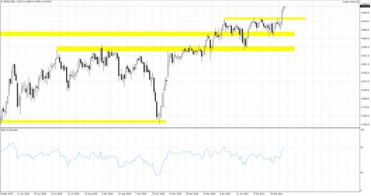 Mediana prognoz rynkowych w przypadku odczytu bazowego zakłada wzrost inflacji o 0.2% m/m. Styczniowe dane zaskoczyły in minus jeśli chodzi o dynamikę cen, która wyniosła jedynie 0.0% m/m. Jeśli i tym razem sytuacja powtórzy się, wówczas obawy o nadmierne przyspieszenie dynamiki cen odsuną się w czasie, co powinno dać kolejne tchnienie spółkom z sektora technologicznego. Jeśli jednak dane nieoczekiwanie zaskoczą w górę, wówczas rentowności mogą wyjść na nowe maksima, co z kolei będzie ciężyć ryzykownym aktywom. Kwestia rentowności na obecną chwilę pozostaje kluczowym czynnikiem dla rynków i do publikacji danych może utrzymywać się atmosfera wyczekiwania. Spółki przemysłowe cały czas radzą sobie jednak dobrze, a niemiecki Dax na początku środowych godzin handlu atakuje nowy szczyt.